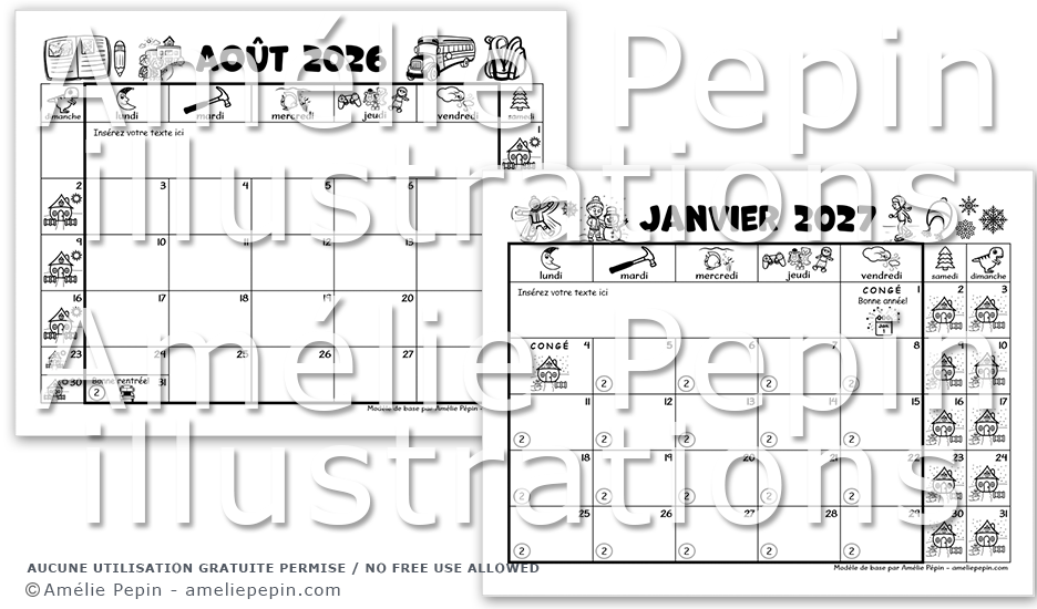 Customizable animal calendars in black and white. The landscape (horizontal) orientation lets you easily display the calendar on your interactive whiteboard or print it out. The grid and illustrated title in French of these calendars won't move, as they're in the background image. To add your own text, double-click in the center of each calendar box to open the text box and enter your information. You can write the numbers of the days in the cycle in the small circles, or delete them if you don't want them there. Insert or delete images to adapt this template to your needs. Choose between the version where the week starts on Sunday or the version where the week starts on Monday.