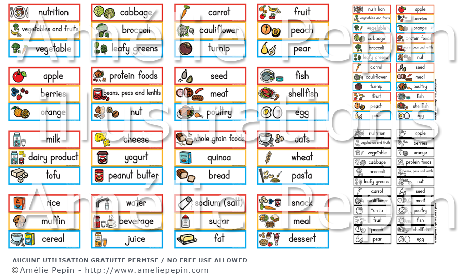 Les mots illustrés sont: nutrition, vegetables and fruits, vegetable, cabbage, broccoli, leafy greens, carrot, cauliflower, turnip, fruit, peach, pear, apple, berries, orange, protein foods, beans, peas and lentils, nut, seed, meat, poultry, fish, shellfish, egg, milk, dairy product, tofu, cheese, yogurt, peanut butter, whole grain foods, quinoa, bread, oats, wheat, pasta, rice, muffin, cereal, water, beverage, juice, sodium (salt), sugar, fat, snack, meal, dessert.