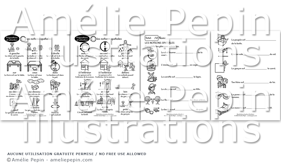 Cet imagier contient 24 prépositions et adverbes illustrés en lien avec les notions d'orientation spatiale (à gauche, entre, à droite, sur, sous, dans, au-dessus, au-dessous, à côté, devant, derrière, ici, autour, au centre, partout, à l'intérieur, à l'extérieur, dehors, en haut, en bas, avant, après, près, loin). Sous chaque image, une courte phrase est écrite à titre d'exemple. Cet outil est conçu pour les élèves en apprentissage du français (langue maternelle ou seconde). Deux feuilles d'exercices sont également offertes pour que les élèves complètent les phrases en s'aidant de l'imagier au besoin.