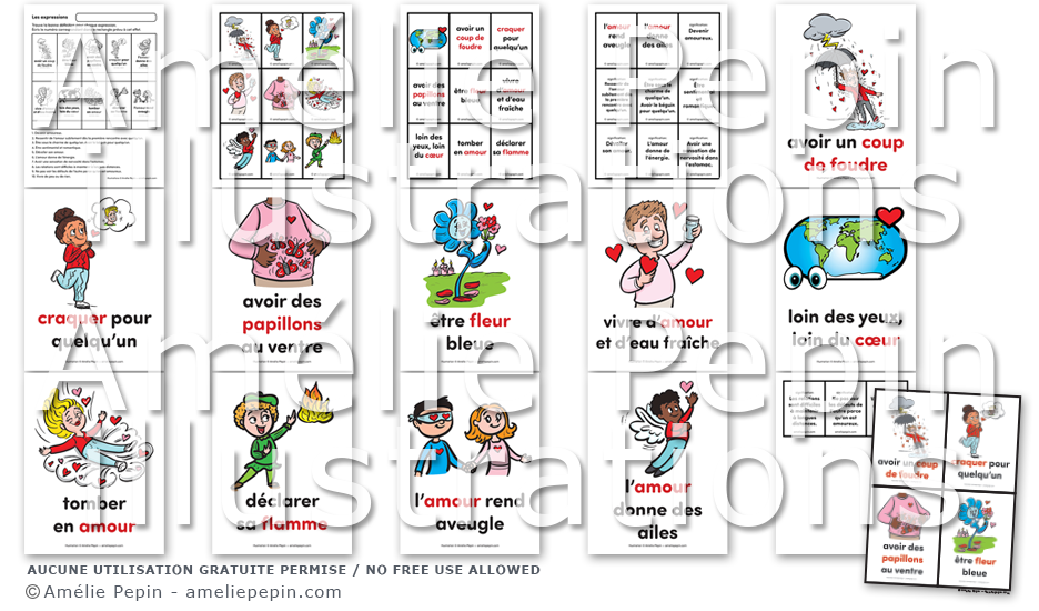 Voici 10 affiches illustrées pour travailler quelques expressions populaires en lien avec l'amour. Vous pouvez les regarder sur TNI ou les imprimer. Beau sujet de conversation pour le thème de la Saint-Valentin! Parmi ces expressions, on retrouve: "avoir un coup de foudre", "craquer pour quelqu'un", "avoir des papillons au ventre", "être fleur bleue", "vivre d'amour et d'eau fraîche", "loin des yeux, loin du coeur", "l'amour donne des ailes", "tomber en amour", "déclarer sa flamme" et "l'amour rend aveugle".